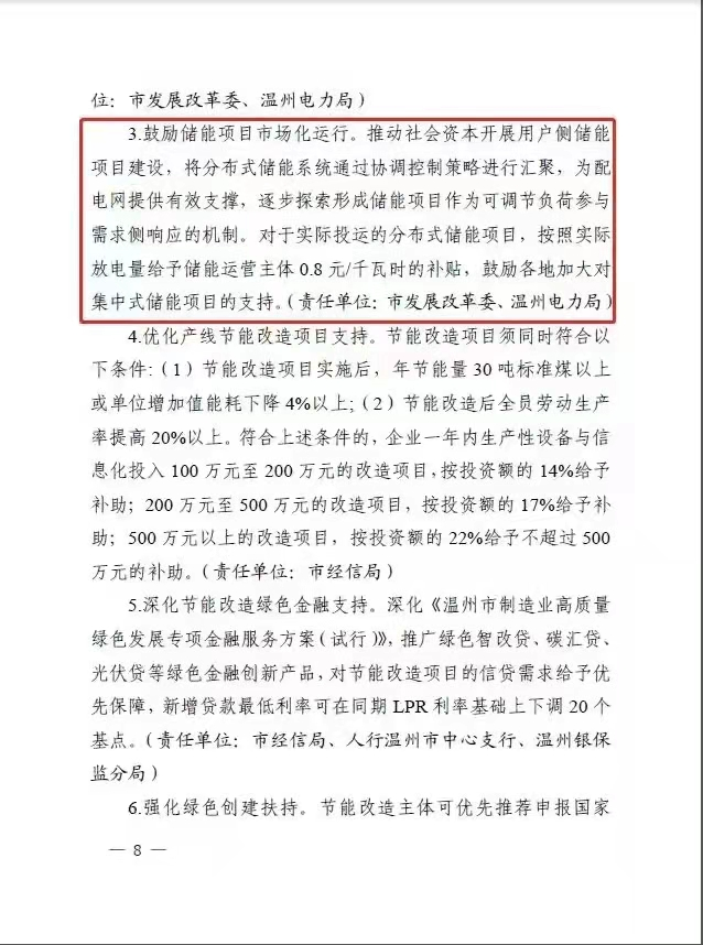 同時(shí),推動(dòng)社會(huì)資本開(kāi)展用戶側(cè)儲(chǔ)能項(xiàng)目建設(shè),將分布式儲(chǔ)能系統(tǒng)通過(guò)協(xié)調(diào)控制策略進(jìn)行匯聚,為配電網(wǎng)提供有效支撐,逐步探索形成儲(chǔ)能項(xiàng)目作為可調(diào)節(jié)負(fù)荷參與需求側(cè)響應(yīng)的機(jī)制。對(duì)于實(shí)際投運(yùn)的分布式儲(chǔ)能項(xiàng)目,按照實(shí)際放電量給予儲(chǔ)能運(yùn)營(yíng)主體0.8元/千瓦時(shí)的補(bǔ)貼,鼓勵(lì)各地加大對(duì)集中式儲(chǔ)能項(xiàng)目的支持。
