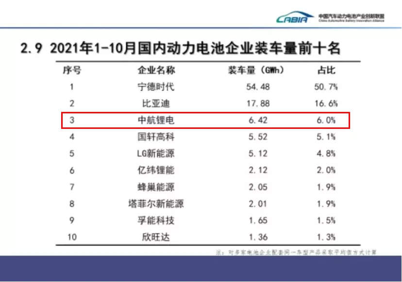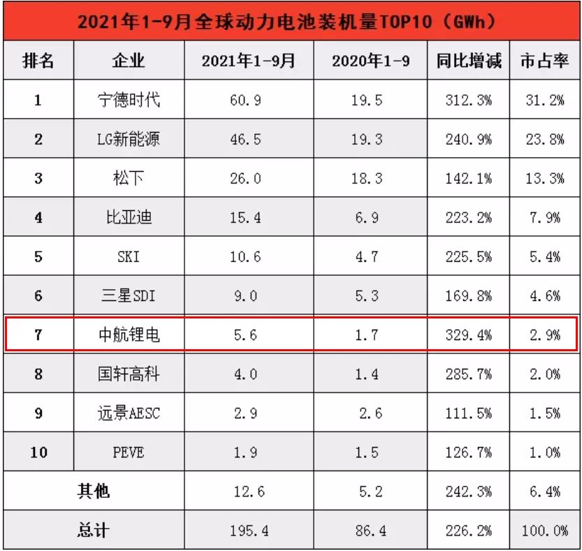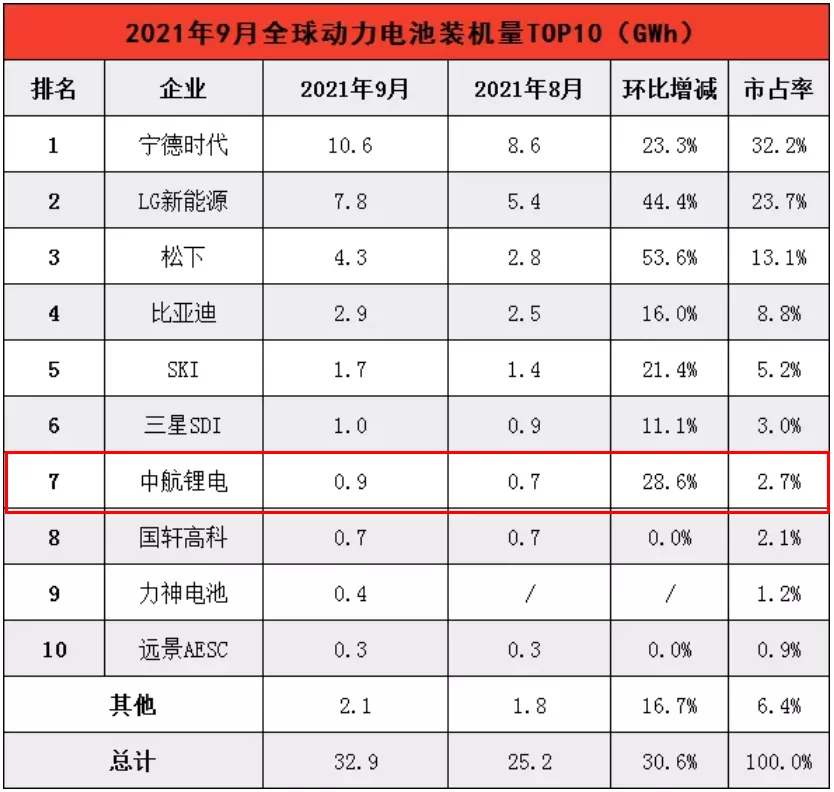 在10月底韓國市場研究機(jī)構(gòu)SNE Research公布的2021年1-9月全球動(dòng)力電池裝車量排行榜中,中航鋰電以5.6GWh的動(dòng)力電池裝車量,位居第七。