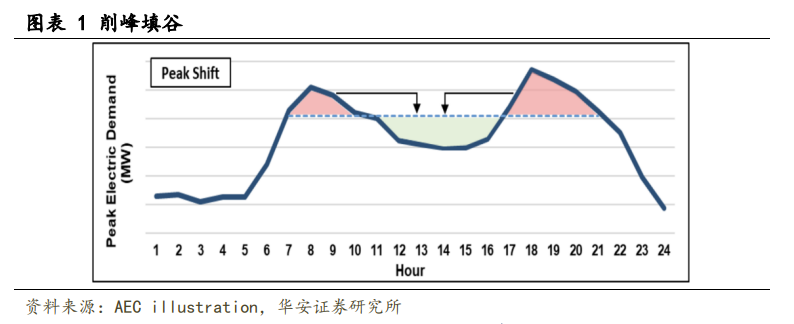 新能源發(fā)電波動(dòng)性明顯,存在峰值時(shí)發(fā)電功率高于電網(wǎng)負(fù)荷,產(chǎn)生棄風(fēng)棄光的問(wèn)題。未來(lái)隨新能源裝機(jī)比例提升,棄風(fēng)棄光的問(wèn)題將日益突出。加強(qiáng)電網(wǎng)基建可以提升其負(fù)荷,使其可以承載更高功率的發(fā)電。配備發(fā)電側(cè)儲(chǔ)能則可以在電網(wǎng)輸送通道受限和光伏/風(fēng)電滿負(fù)荷工作的情況下實(shí)現(xiàn)調(diào)峰,平滑新能源發(fā)電輸出曲線,緩解電網(wǎng)負(fù)擔(dān)。削峰填谷可以在低需求時(shí)段吸收電力,并在高峰需求時(shí)段將其釋放到電網(wǎng)或支持客戶的負(fù)載。這有效地將一些負(fù)荷從高峰時(shí)段(紅色)轉(zhuǎn)移到非高峰時(shí)段(綠色)。