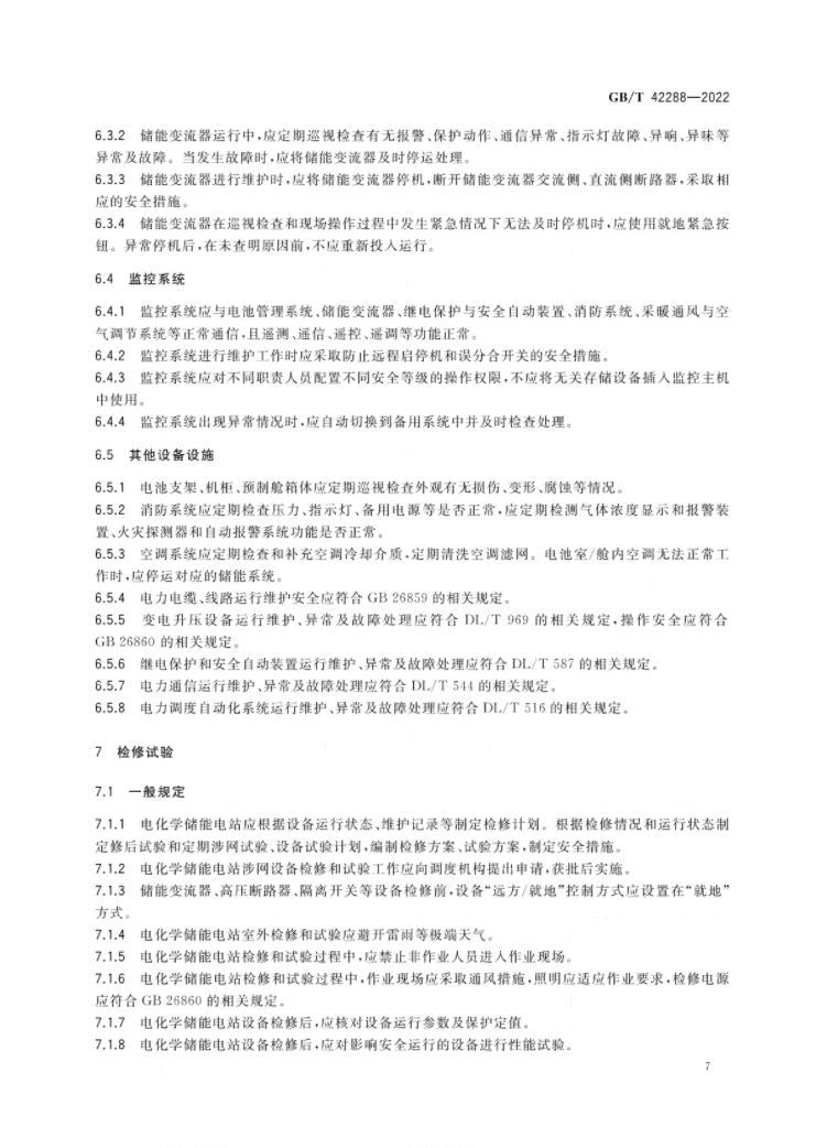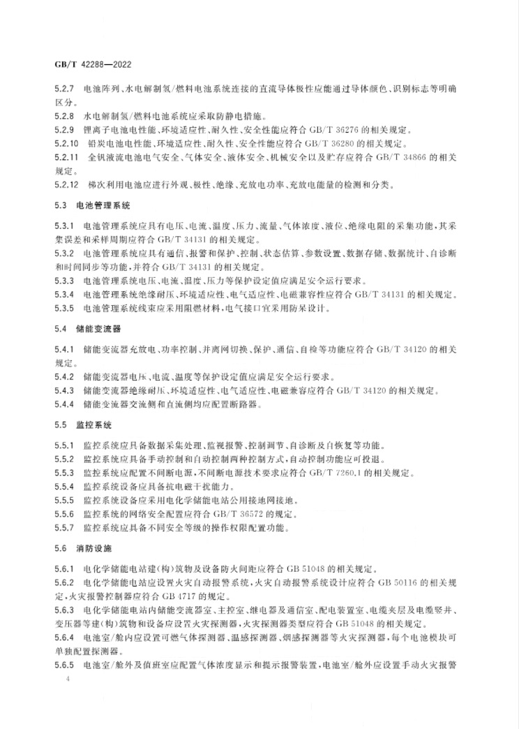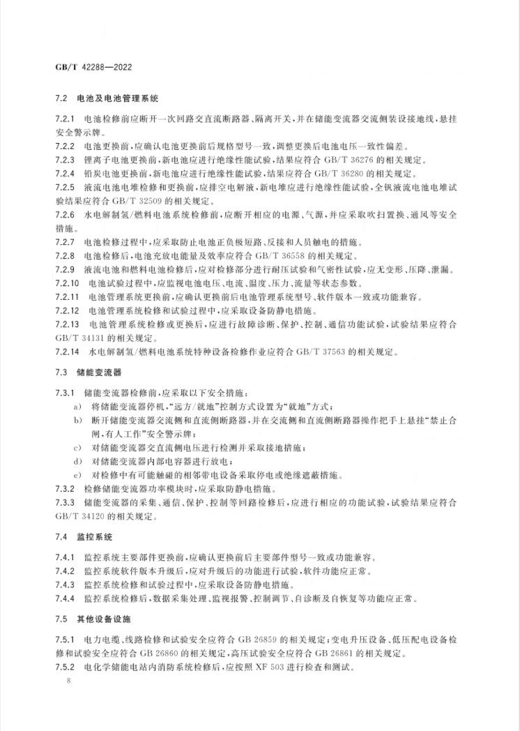 文件適用于鋰離子電池、鉛酸(炭)電池、液流電池、水電解制氫/燃料電池儲(chǔ)能電站。該標(biāo)準(zhǔn)規(guī)定了電化學(xué)儲(chǔ)能電站設(shè)備設(shè)施安全技術(shù)要求、運(yùn)行、維護(hù)、檢修、試驗(yàn)等方面的安全要求,涉及儲(chǔ)能電池、BMS、PCS、監(jiān)控、消防等各類設(shè)備的檢修規(guī)定。