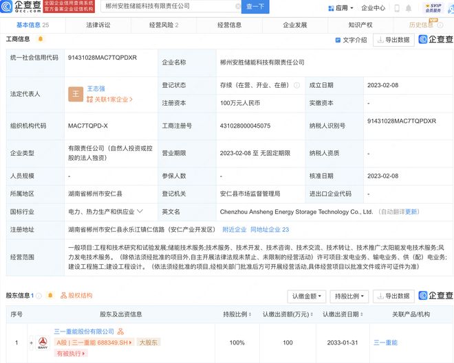 近日,郴州安勝儲(chǔ)能科技有限責(zé)任公司成立,法定代表人為王志強(qiáng),注冊(cè)資本100萬元人民幣,經(jīng)營范圍包含:儲(chǔ)能技術(shù)服務(wù);太陽能發(fā)電技術(shù)服務(wù);風(fēng)力發(fā)電技術(shù)服務(wù)等。企查查股權(quán)穿透顯示,該公司由三一重能100%控股。