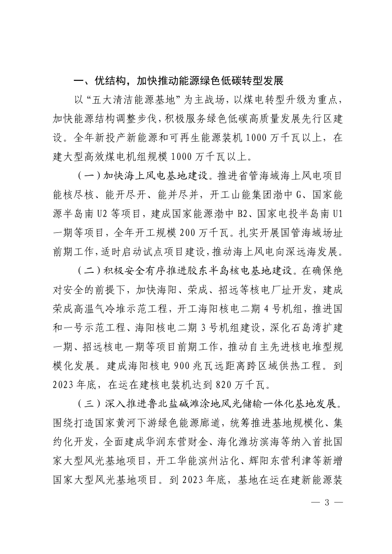 深入推進(jìn)魯北鹽堿灘涂地風(fēng)光儲輸一體化基地發(fā)展:圍繞打造國家黃河下游綠色能源廊道,統(tǒng)籌推進(jìn)基地規(guī)?;?、集約化開發(fā),全面建成華潤東營財(cái)金、?;癁H坊濱海等納入首批國家大型風(fēng)光基地項(xiàng)目,開工華能濱州沾化、輝陽東營利津等新增國家大型風(fēng)光基地項(xiàng)目。到2023年底,基地在運(yùn)在建新能源裝機(jī)達(dá)到700萬千瓦。