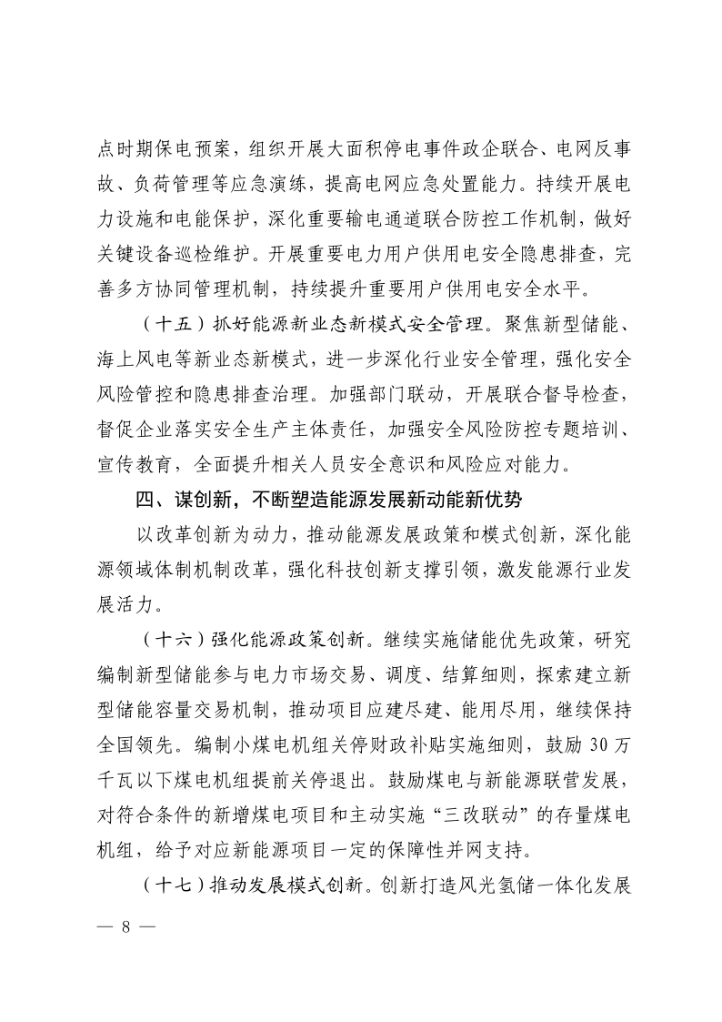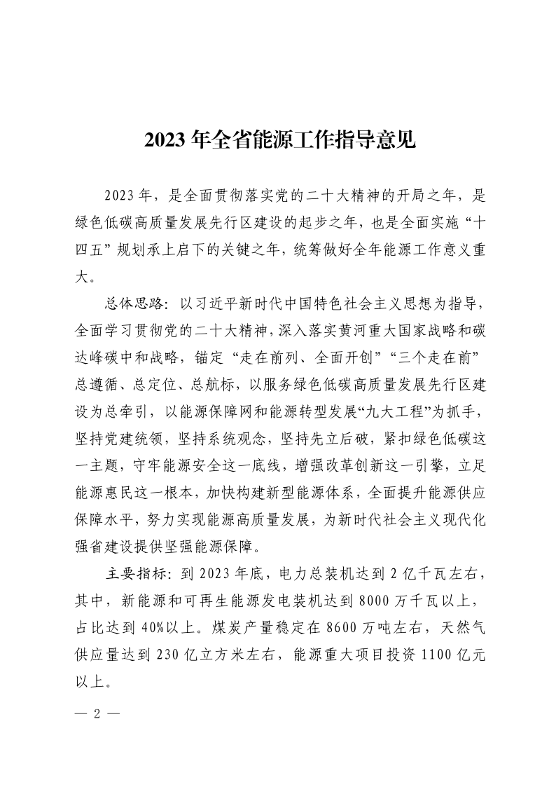 到2023年底,電力總裝機(jī)達(dá)到2億千瓦左右,其中,新能源和可再生能源發(fā)電裝機(jī)達(dá)到8000萬千瓦以上,占比達(dá)到40%以上。煤炭產(chǎn)量穩(wěn)定在8600萬噸左右,天然氣供應(yīng)量達(dá)到230億立方米左右,能源重大項(xiàng)目投資1100億元以上。