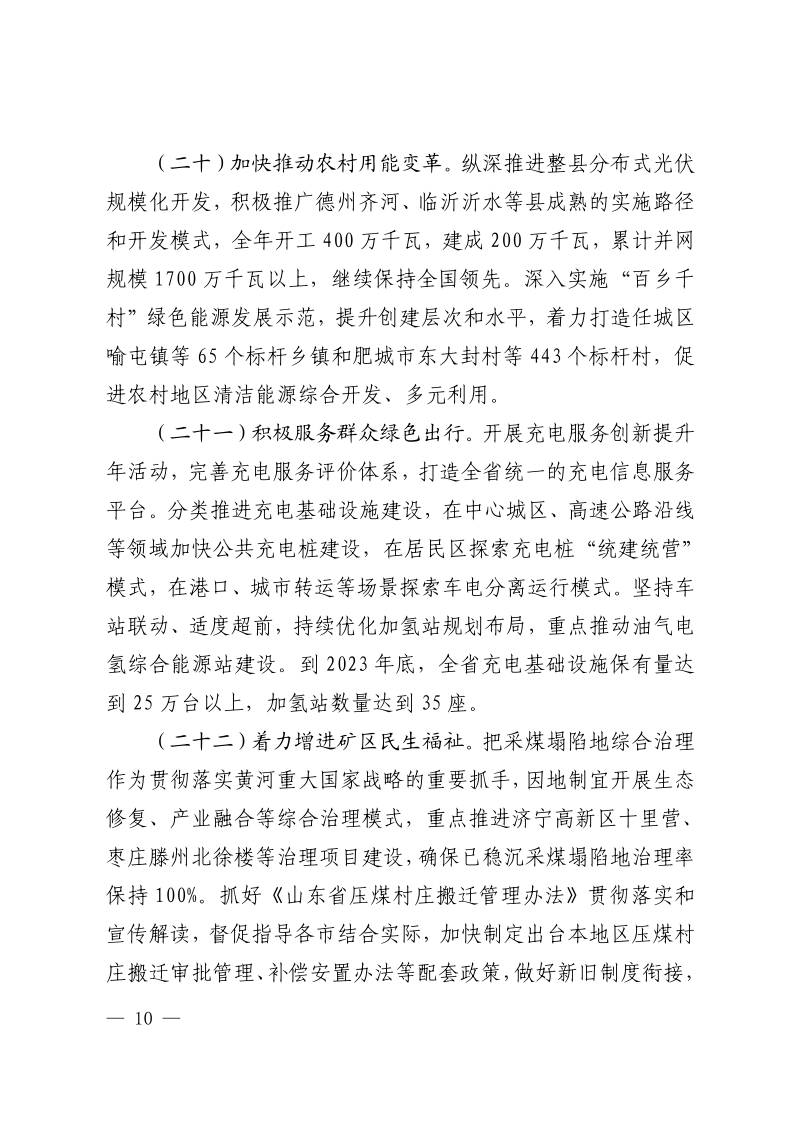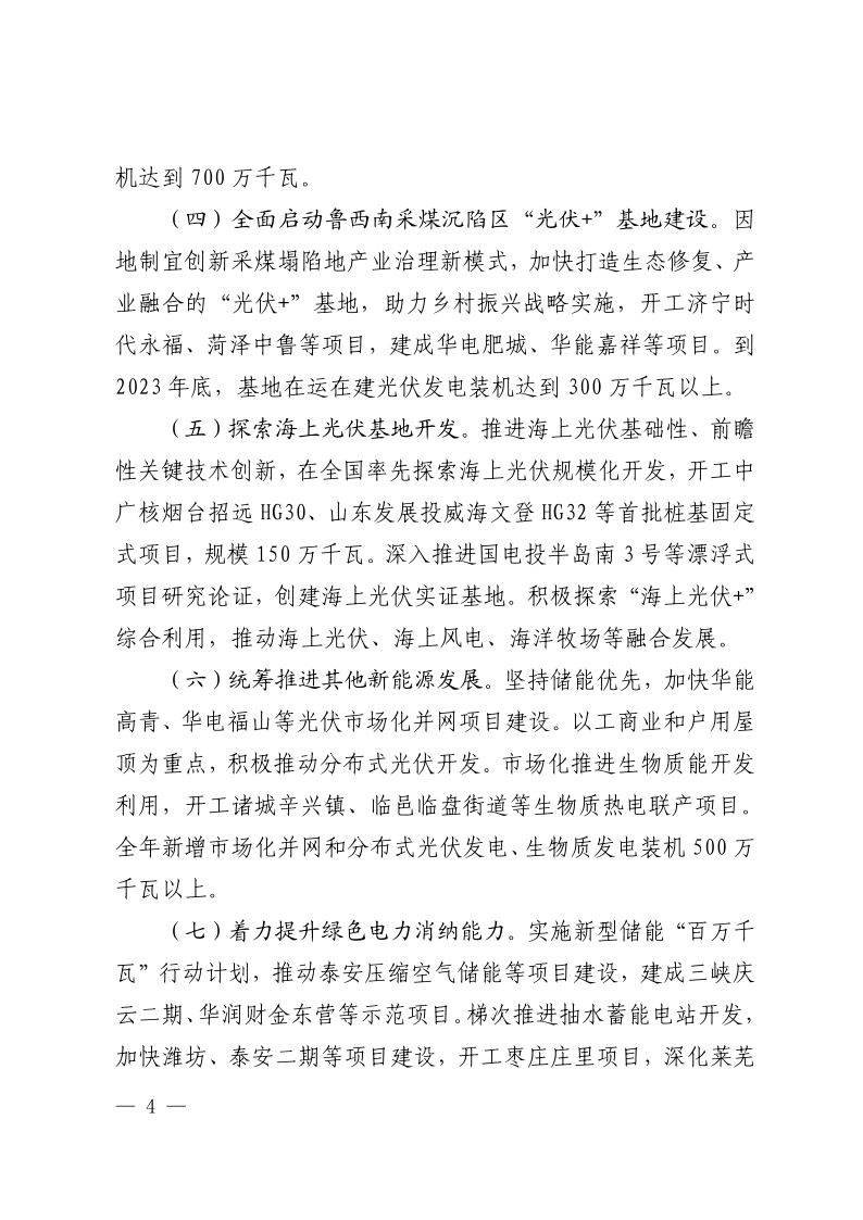 全面啟動魯西南采煤沉陷區(qū)“光伏+”基地建設(shè):因地制宜創(chuàng)新采煤塌陷地產(chǎn)業(yè)治理新模式,加快打造生態(tài)修復(fù)、產(chǎn)業(yè)融合的“光伏+”基地,助力鄉(xiāng)村振興戰(zhàn)略實(shí)施,開工濟(jì)寧時(shí)代永福、菏澤中魯?shù)软?xiàng)目,建成華電肥城、華能嘉祥等項(xiàng)目。到2023年底,基地在運(yùn)在建光伏發(fā)電裝機(jī)達(dá)到300萬千瓦以上。