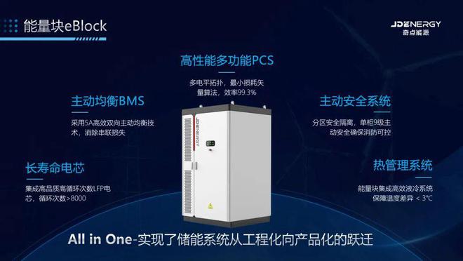 基于“all in one”的產(chǎn)品化設(shè)計(jì)理念,奇點(diǎn)能源能量塊eBlock創(chuàng)新性地將長(zhǎng)壽命電芯、高效均衡BMS、高性能多功能PCS、主動(dòng)安全系統(tǒng)、高效熱管理系統(tǒng)融于單個(gè)戶外布署機(jī)柜,形成了一體化的智慧能量塊產(chǎn)品eBlock,為電化學(xué)儲(chǔ)能行業(yè)提供了一種全新的解決方案。其真正做到了把儲(chǔ)能工程轉(zhuǎn)化為標(biāo)準(zhǔn)化產(chǎn)品,定義了儲(chǔ)能系統(tǒng)集成新標(biāo)準(zhǔn)。