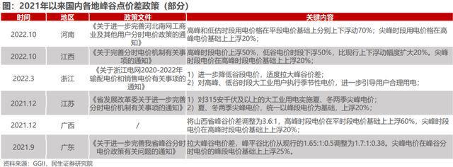 前面提到,終端看政策。2022年12月22日,國(guó)家發(fā)改委、國(guó)家能源局印發(fā)《關(guān)于做好2023年電力中長(zhǎng)期合同簽訂履約工作的通知》,要求各地制定同本地電力供需和市場(chǎng)建設(shè)情況相適應(yīng)的中長(zhǎng)期合同分時(shí)段價(jià)格形成機(jī)制,合理拉大峰谷價(jià)差,加強(qiáng)中長(zhǎng)期與現(xiàn)貨價(jià)格機(jī)制銜接。自2021年下半年以來,全國(guó)已有河南、江西、浙江、河北、山西、廣東、山東等超過20個(gè)省市調(diào)整分時(shí)電價(jià)政策,要求適度拉大峰谷電價(jià)差水平。