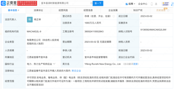 企查查APP顯示,2023年3月2日,宜豐縣潤時新能源有限公司成立。該公司的法定代表人為楊正舉,注冊資本1000萬元人民幣。