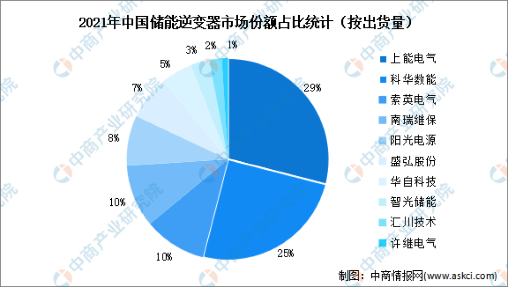 2021年中國新增投運(yùn)的新型儲(chǔ)能項(xiàng)目中,裝機(jī)規(guī)模排名前十位的儲(chǔ)能逆變器提供商依次為:上能電氣、科華數(shù)能、索英電氣、南瑞繼保、陽光電源、盛弘股份、華自科技、智光儲(chǔ)能、匯川技術(shù)和許繼電氣。其中,上能電氣、科華數(shù)能市場份額占比分別為29%、25%。