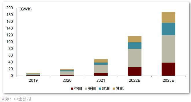 據(jù)中金公司預(yù)測(cè),今年全球儲(chǔ)能需求有望達(dá)189GWh,同比增長超60%。美國、中國、歐盟成為全球三大儲(chǔ)能市場(chǎng)。