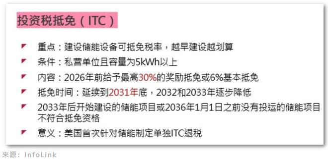 對(duì)于儲(chǔ)能來說,這是美國首次針對(duì)獨(dú)立儲(chǔ)能進(jìn)行投資稅抵免(Investment Tax Credit, ITC)。