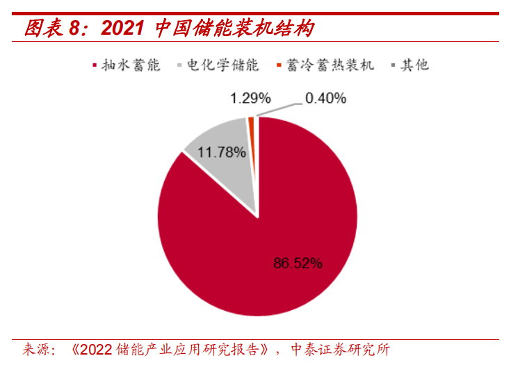 2021年中國(guó)抽水蓄能裝機(jī)功率38GW,占比全部?jī)?chǔ)能的86.52%,電化學(xué)儲(chǔ)能裝機(jī)功率5GW,占比11.78%,抽水蓄能是我國(guó)存量?jī)?chǔ)能的主要形式。2021年中國(guó)新增抽水蓄能裝機(jī)5GW,占比71.14%,電化學(xué)儲(chǔ)能新增2GW,占比24.94%,電化學(xué)儲(chǔ)能裝機(jī)增速超過(guò)抽水蓄能。抽水蓄能需要尋找合適地形及水域,同時(shí)可能涉及搬遷移民問(wèn)題,外部限制因素較多,建設(shè)期通常長(zhǎng)達(dá)數(shù)年。我國(guó)水電資源主要集中在南方地區(qū)尤其是西南地區(qū),西北等地區(qū)缺發(fā)建設(shè)大型抽蓄配套新能源的條件。而電化學(xué)儲(chǔ)能則對(duì)外界條件要求不高,建設(shè)期較短,單體投資小,因而成為新能源配儲(chǔ)的普遍選擇。
