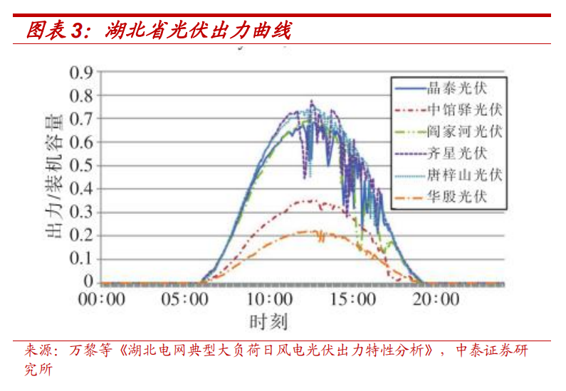是一天中的最低位。光伏出力曲線和負(fù)荷曲線相對(duì)更適配,白天為曲線高位,但以湖北省為例,20時(shí)至23時(shí)負(fù)荷仍處于相對(duì)高位,而此時(shí)光伏出力為0。因此當(dāng)新能源發(fā)電量占比達(dá)到一定程度,電源和負(fù)荷的曲線差異將對(duì)電網(wǎng)的運(yùn)行效率和安全造成沖擊,或?qū)е麓罅織夛L(fēng)棄光現(xiàn)象。