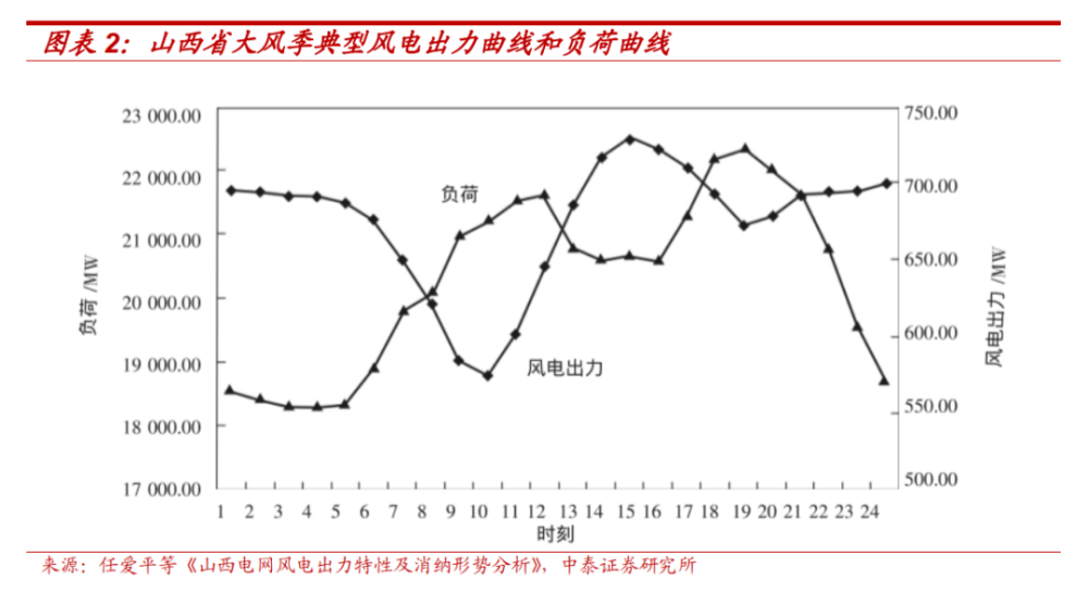 根據(jù)山西省大風(fēng)季典型風(fēng)電出力曲線和負(fù)荷曲線可見(jiàn),風(fēng)電出力和負(fù)荷二者具有較大差異,風(fēng)電在21時(shí)至次日5時(shí)出力處于相對(duì)高位,而此時(shí)用電負(fù)荷卻