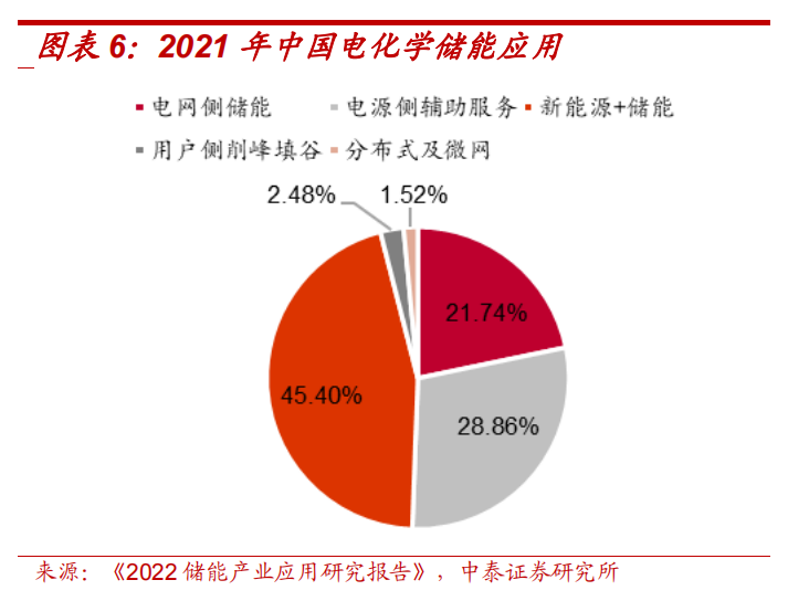 2021年起,各省密集發(fā)布新能源項(xiàng)目配套儲(chǔ)能政策,配臵比例主要在 10%-20%區(qū)間,配臵時(shí)長(zhǎng)1-2小時(shí),推動(dòng)我國(guó)電化學(xué)儲(chǔ)能高速增長(zhǎng)。根據(jù)《2022儲(chǔ)能產(chǎn)業(yè)研究報(bào)告》,2021年我國(guó)新能源配儲(chǔ)占電化學(xué)儲(chǔ)能應(yīng)用的45.40%,我國(guó)電化學(xué)儲(chǔ)能主要應(yīng)用在電源側(cè)和電網(wǎng)側(cè)來(lái)支持風(fēng)光新能源消納和新型電力系統(tǒng)建設(shè)。