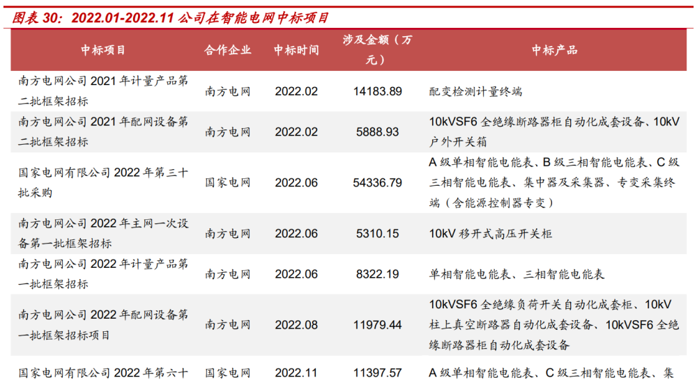 公司海內(nèi)外訂單飽滿,預計未來業(yè)績將持續(xù)放量。在 2021 年,科陸 電子智能電表產(chǎn)品和用電信息采集終端產(chǎn)品系列的總中標金額約 9.1 億元,以中標額計算的整體市場占有率達到約 2.67%。其中,公司在 國家電網(wǎng)招標采購項目中標約 5.96 億元,在南方電網(wǎng)計量產(chǎn)品框架招 標項目中標約 2.19 億元,在各省電網(wǎng)公司 2021 年計量箱招標項目 中標約 1.69 億元。自 2022 年起,上半年中,公司在國網(wǎng)第一次電能 表招標及南網(wǎng)第一批框架招標中占比達 4.1%、5.6%,位列中標金額的 第一梯隊,成功實現(xiàn)在兩網(wǎng)市場份額占比提升;截至 11 月,公司已實 現(xiàn) 5 次中標,中標總金額達 11.14 億元,同比 2021 年中標總金額 7.44 億元,公司國內(nèi)訂單量實現(xiàn)大幅提升。海外方面,公司持續(xù)在海外電表 業(yè)務深耕,業(yè)務主要集中在非洲、亞太、南美等地區(qū),并在歐洲、美洲 多個國家實現(xiàn)業(yè)績突破。