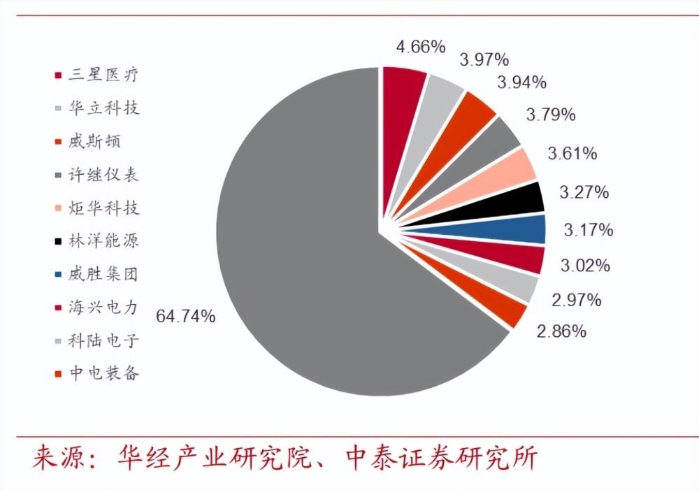 智能電表行業(yè)處于充分競爭狀態(tài),市占率穩(wěn)定。參與智能電表及用電信 息集中采集招標的企業(yè)數(shù)量較多,國家電網(wǎng)智能電表及用電信息采集系 統(tǒng)招標入圍公司已超過百家,集中度較低,第一梯隊三星醫(yī)療、東方威 斯頓、許繼電氣、炬華科技市占率維持在 3%-5%左右。長期來看,市場 訂單分散,我國智能電表行業(yè)競爭格局趨于穩(wěn)定。在 2022 年第一批智 能電表中標中,三星醫(yī)療、東方威思頓、科陸電子、許繼、華立科技分 別占比 5.1%、4.8%、4.1%、4.1%、4.1%,其中,科陸電子中標份額 較 2021 年有較大提升。