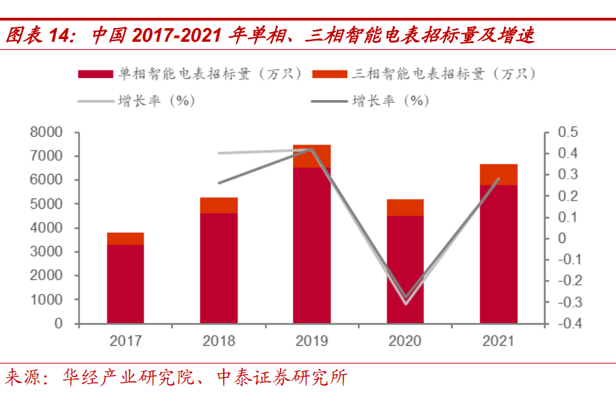 智能電表需求觸底反彈,招標量整體保持上升趨勢。我國智能電表市場 需求主要來源于國家電網(wǎng)和南方電網(wǎng),2020 年受疫情影響國網(wǎng)建設進度 放緩,因此單相、三相智能電表招標量同比下降 30.8%、27.5%。隨疫 情好轉(zhuǎn),市場需求恢復,智能電網(wǎng)招標量觸底反彈,單相、三相智能電 表招標量同比上升 28.3%、27.7%,其中國家電網(wǎng)招標量達 6674 萬只, 同比增長 28%,南方電網(wǎng)招額達 26 億元,同比增長 49.8%。