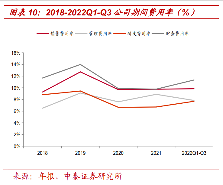 期間費用呈下降趨勢,但仍有較大進步空間。2019-2021 年公司期間費 用率分別為 36.3%/45.3%/33.8%/35.1%/36.7%,雖然呈現(xiàn)總體下降趨勢, 但仍高于同行平均值,費用管控能力有望進一步提升。其中 2022 年前 三季度銷售/管理/研發(fā)/財務費用率分別為 9.8%/7.8%/7.7%/11.3%,打破 前兩年的下降趨勢,主要是因為公司收入體量較低,規(guī)模效應尚未體現(xiàn), 且公司近年來營運資金緊缺,導致公司主動放棄大量周期長、墊資金額高的訂單,也限制了營收規(guī)模的增長,導致各方面人效降低。但隨著公 司業(yè)務擴張的不斷推進和資金鏈的緩解,期間費用率有望好轉(zhuǎn)。
