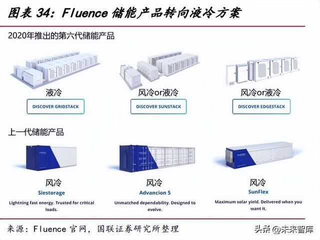 當前國內儲能液冷滲透率較低,海外市場對液冷接受度較高。據 GGII,2021 年 國內儲能領域液冷溫控滲透率僅為 12%,預計 2025 年有望迅速提升至 45%。海外 市場缺乏統(tǒng)計數據,但從全球系統(tǒng)集成龍頭 Fluence 的產品結構變化可以看出液冷 滲透率快速提升的趨勢。Fluence 在 2020 年以前的集成產品均為風冷方案,2020 年 后推出的新一代產品中,光伏配儲和工商業(yè)儲能產品提供風冷和液冷兩種選擇,電網 級儲能產品僅提供液冷配置。