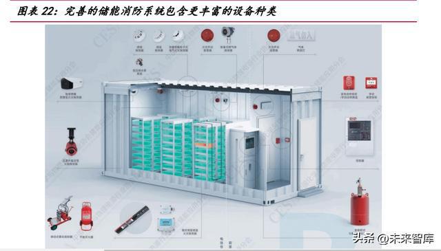 隨著儲能安全標準趨嚴,儲能消防和溫控系統(tǒng)的重要程度有望顯著增強。相比于 國外,雖然我國電化學儲能電站事故發(fā)生較少,但是儲能安全標準體系不夠健全,缺乏國外政策提到的一些重要規(guī)范,比如 AS/NZS 5139 要求電池系統(tǒng)安裝在特定位置; UL9540A 強調了單個電池儲能系統(tǒng)單元火災緩解方法;NFPA 855 對于儲能系統(tǒng)單 元間以及與墻壁的安全距離進行了規(guī)定等。由于國內外儲能電站事故頻發(fā),我國儲能 安全標準向全球標準靠攏,不斷完善趨嚴,儲能消防和溫控系統(tǒng)的重要程度有望顯著 增強。