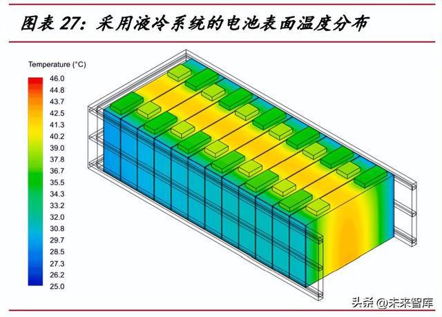 液冷系統(tǒng)一般采用乙二醇水溶液作為冷卻劑,冷卻液流經集成在電池系統(tǒng)內部的 液冷板,以降低電池溫度。液冷系統(tǒng)可使電池之間的堆疊更加緊密以提高能量密度; 并且具備更強的散熱性能,降低電池溫差,提升一致性水平,降低熱失控風險。液冷 技術此前在 SVG、數據中心、直流設備、電動汽車等領域已廣泛使用,在儲能領域 的新應用也逐步成為市場的主流選擇。