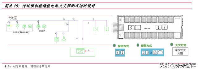當前儲能系統(tǒng)火災探測及消防設計存在不足。目前預置艙儲能電站火災探測報 警系統(tǒng)參照 GB 50116《火災自動報警系統(tǒng)設計規(guī)范》,配置使用點型感溫和感煙探 測器,消防預警系統(tǒng)采用獨立的通訊方式,主要存在三點不足: 1)探測部分:配置的點型感溫和點型感煙探測器,只有在煙氣和溫度已經蔓延 到艙室后才能起到報警作用,不適用于鋰離子電池熱失控早期預警,屬于電池熱擴散 事故發(fā)生后的火災報警。 2)火災抑制部分:在整個預制艙內做淹沒式的滅火藥劑噴放,滅火藥劑無法作 用于發(fā)生熱失控的電池箱內部,不能起到定向撲滅火災的作用。 3)聯(lián)動部分:傳統(tǒng)消防作為獨立運行的系統(tǒng),無法與 BMS 或 EMS 系統(tǒng)通訊形 成有效聯(lián)動。