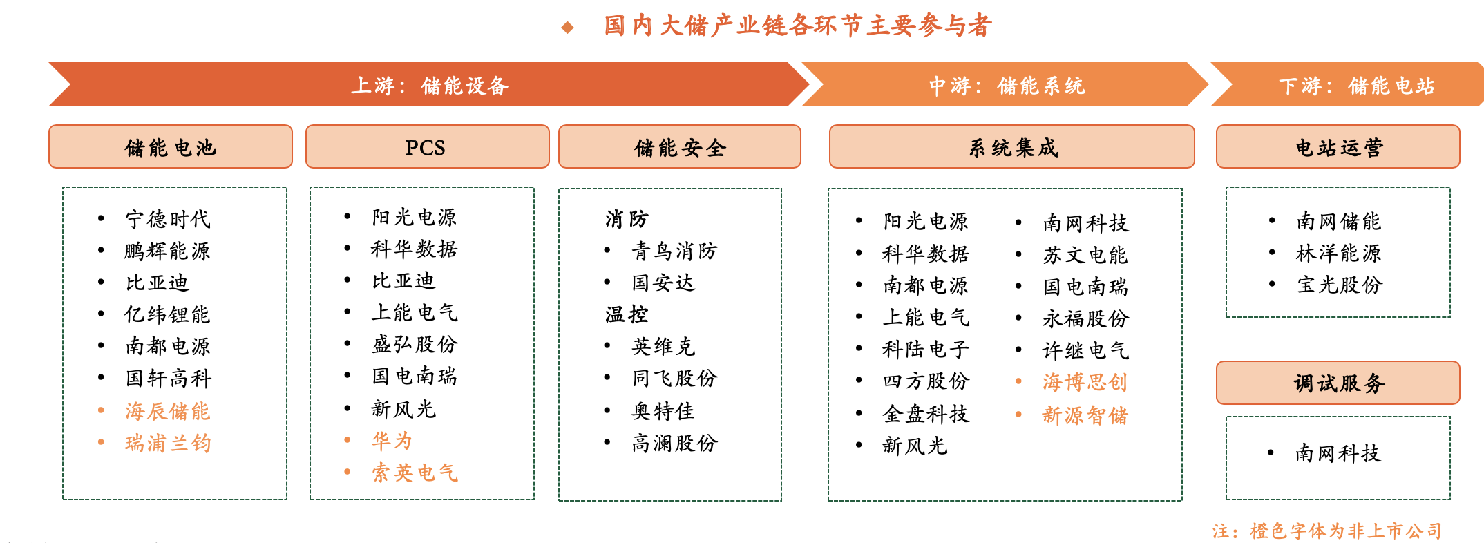 大儲(chǔ)產(chǎn)業(yè)鏈主要包括上游儲(chǔ)能設(shè)備、中游系統(tǒng)集成、下游電站等環(huán)節(jié)。儲(chǔ)能電池和PCS是大儲(chǔ)產(chǎn)業(yè)鏈價(jià)值量最大的兩個(gè)環(huán)節(jié),陳驍?shù)热苏J(rèn)為,儲(chǔ)能電池絕對(duì)龍頭寧德時(shí)代,第二梯隊(duì)比亞迪、鵬輝能源、億緯鋰能、國(guó)軒高科、南都電源、海辰儲(chǔ)能等有望借國(guó)內(nèi)大儲(chǔ)市場(chǎng)加速贏得動(dòng)力電池之外的第二成長(zhǎng)曲線。國(guó)內(nèi)大儲(chǔ)PCS頭部企業(yè)陽(yáng)光電源、科華數(shù)據(jù)、上能電氣、盛弘股份、國(guó)電南瑞、新風(fēng)光等在裝機(jī)提速+毛利改善下業(yè)績(jī)有望受益。