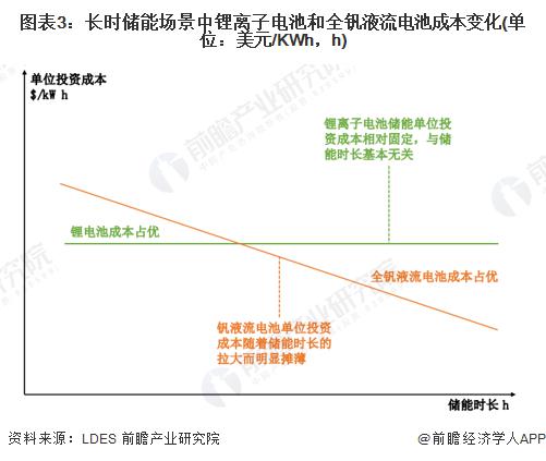 根據(jù)長時(shí)儲(chǔ)能委員會(huì) ( LDES ) 與麥肯錫 2021 年底聯(lián)合發(fā)布的報(bào)告,由于配套的儲(chǔ)能時(shí)長較長,長時(shí)儲(chǔ)能在考慮投資成本時(shí)更加注重單位能量 ( 每 Wh ) 的投資成本而非單位功率 ( 每 W ) 的投資成本。隨著儲(chǔ)能時(shí)長的增加,全釩液流電池系統(tǒng)的單位成本將得到明顯攤薄 ( 功率單元成本不變,僅需增加能量單元 ) ,而鋰電池系統(tǒng)的單位成本則基本固定。因此,從成本角度,釩液流電池在長時(shí)儲(chǔ)能的場景中較當(dāng)前主流的鋰離子電池具備一定的比較優(yōu)勢。