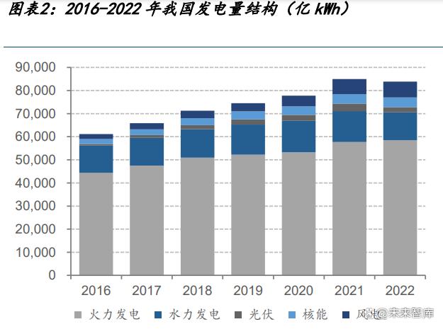 火力發(fā)電碳排放量仍呈現(xiàn)逐年上漲態(tài)勢(shì)。近五年火力發(fā)電量占比逐年下降,從 2017 年的 72%下降到 2021 年的 71%,但是因?yàn)樯鐣?huì)總用電量不斷上升,火力發(fā)電的絕對(duì)數(shù) 值仍然持續(xù)增加,從 2017 年的 4.8 萬(wàn)億 kWh 增加到 2021 年的 5.8 萬(wàn)億 kWh,進(jìn)而帶 來(lái)的碳排放量的增長(zhǎng),減碳形勢(shì)不容樂(lè)觀。