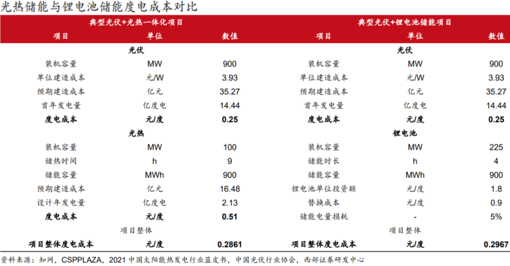 在現(xiàn)行項目配置下,西部證券對比了“光伏+光熱”和“光伏+鋰電池”兩種項目的經(jīng)濟(jì)性,兩者項目整體的度電成本分別為 0.2861/0.2967 元 /度,光熱的儲能經(jīng)濟(jì)性更高,有利于“十四五”期間裝機(jī)加速發(fā)展。