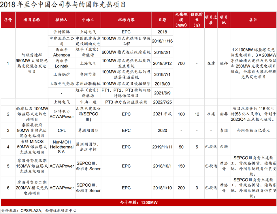 中國公司光熱技術(shù)已經(jīng)較為成熟,有豐富的出海經(jīng)驗,據(jù)不完全統(tǒng)計, 2018 年至今中國公司作為 EPC 方參與的國際光熱項目規(guī)模合計達(dá)到 1200MW,占比達(dá)到 1/6。