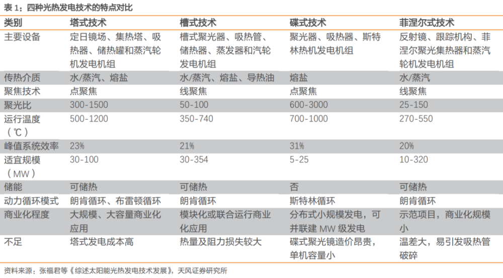 在各種形式的光熱發(fā)電技術(shù)中,塔式熔鹽儲能光熱發(fā)電因其較高的系統(tǒng)效率,成為目前我國最主流的光熱發(fā)電技術(shù)路線,但其發(fā)電成本較高。天風(fēng)證券認(rèn)為,隨著未來技術(shù)的發(fā)展,成本有較大的下降空間。