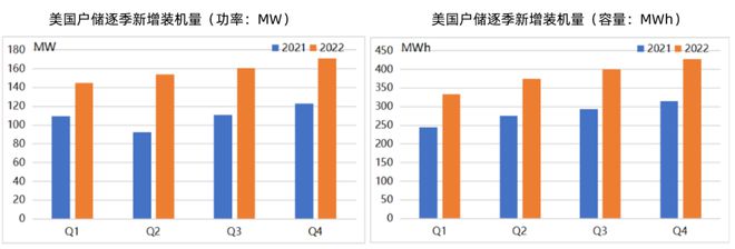 根據(jù)Wood Mackenzie數(shù)據(jù)顯示,2022年美國新增工商儲裝機容量為164MW/354MWh,同比+1%/+1%。其中,2022Q4新增48MW/96MWh,同比-17%/-27%,環(huán)比+80%/+71%。