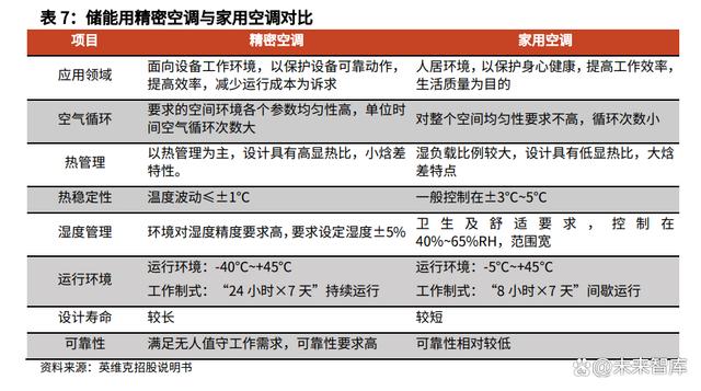 風冷是當前主流儲能方案,技術難點在于風道設計和空調(diào)控制。不同儲能系 統(tǒng)內(nèi)電池的散熱量及擺放位置不同,為保持系統(tǒng)內(nèi)部溫差較小,需要對其內(nèi)部 的風道進行定制化設計。相較于家用空調(diào),儲能溫控系統(tǒng)中使用的精密空調(diào)具 有溫濕度控制精度高、壽命長等特點,技術壁壘較高,家用空調(diào)企業(yè)跨界存在 較大難度,目前這一領域的代表性企業(yè)有英維克、申菱環(huán)境等。