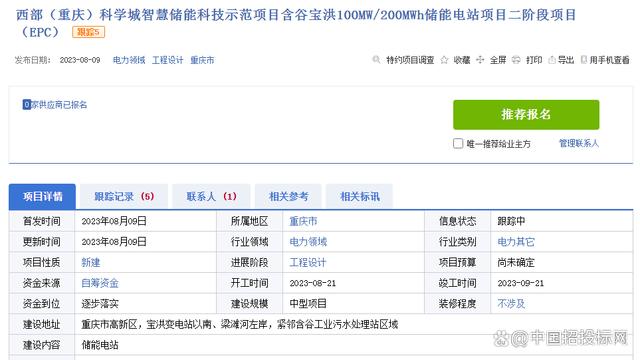 接下來我們一起看一個建設地點位于重慶市的西部(重慶)科學城智慧儲能科技示范項目含谷寶洪100MW/200MWh儲能電站項目二階段項目(EPC)