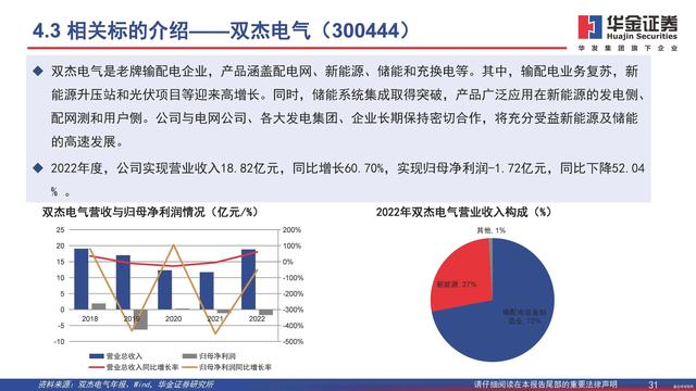 雙杰電氣是老牌輸配電企業(yè),產(chǎn)品涵蓋配電網(wǎng)、新能源、儲能和充換電等。其中,輸配電業(yè)務(wù)復(fù)蘇,新能源升壓站和光伏項目等迎來高增長。同時,儲能系統(tǒng)集成取得突破,產(chǎn)品廣泛應(yīng)用在新能源的發(fā)電側(cè)、配網(wǎng)測和用戶側(cè)。公司與電網(wǎng)公司、各大發(fā)電集團、企業(yè)長期保持密切合作,將充分受益新能源及儲能的高速發(fā)展。2022年度,公司實現(xiàn)營業(yè)收入18.82億元,同比增長60.70%,實現(xiàn)歸母凈利潤-1.72億元,同比下降52.04% 。
