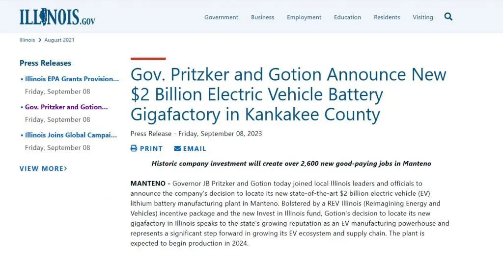 本月初,美國伊利諾伊州政府官網(wǎng)曾發(fā)布消息,宣布國軒高科將斥資20億美元(約147億元人民幣)在該州坎卡基縣曼特諾新建電動(dòng)汽車電池超級(jí)工廠。