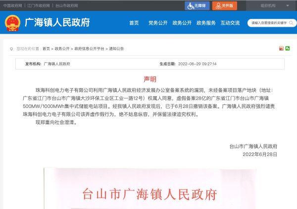 臺(tái)山市廣海鎮(zhèn)人民政府在2022年6月28日發(fā)布的一則聲明顯示:珠海科創(chuàng)電力電子有限公司(目前已更名為“珠??苿?chuàng)儲(chǔ)能科技有限公司”)利用廣海鎮(zhèn)人民政府經(jīng)濟(jì)發(fā)展辦公室備案系統(tǒng)的漏洞,未經(jīng)備案項(xiàng)目落戶地塊權(quán)屬人同意,虛假備案28億的廣東省江門(mén)市臺(tái)山市廣海鎮(zhèn)500MW/1000MWh集中式儲(chǔ)能電站項(xiàng)目。聲明稱,該鎮(zhèn)已于2022年6月28日撤銷該備案。