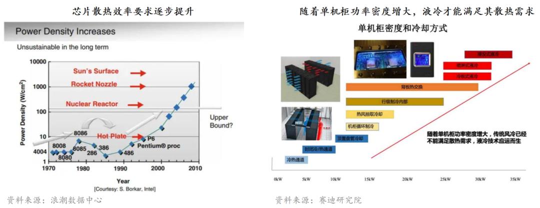 據(jù)通信院公布,我國(guó)IDC能耗支出占TCO(整體運(yùn)營(yíng)支出)的60%—70%,到2025年全球數(shù)據(jù)中心單機(jī)柜平均功率將達(dá)到25KW,這對(duì)目前傳統(tǒng)風(fēng)冷技術(shù)均是十分嚴(yán)峻的挑戰(zhàn)。隨著功耗密度的提升,系統(tǒng)溫度將加速升高,因此提高散熱效率成為必需,在此背景下,液冷溫控成為高密度 IDC 能耗優(yōu)化的重要技術(shù)。