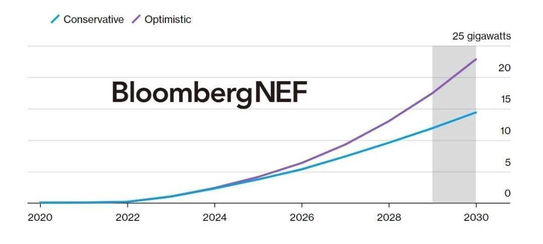 圖:中國液流電池裝機規(guī)模預測(彭博新能源財經)
