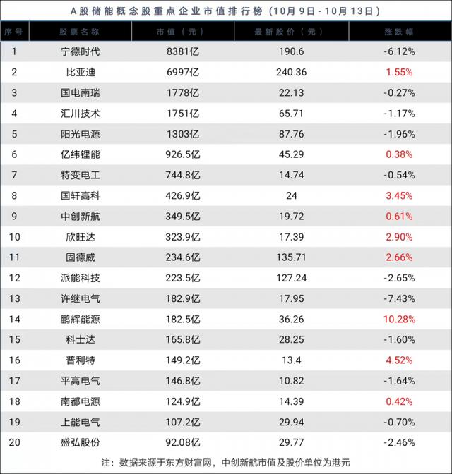 上周(10月9日-10月13日),東方財富儲能概念板塊微增0.39%,漲勢已持續(xù)3周。在《華夏時報》重點關注的20家上市儲能企業(yè)中,有9家上漲,11家下跌。鵬輝能源以10.28%的幅度領漲,普利特、國軒高科、欣旺達、固德威、比亞迪、南都電源、億緯鋰能和中創(chuàng)新航分別上漲了4.52%、3.45%、2.90%、2.66%、1.55%、0.42%、0.38%和0.61%。