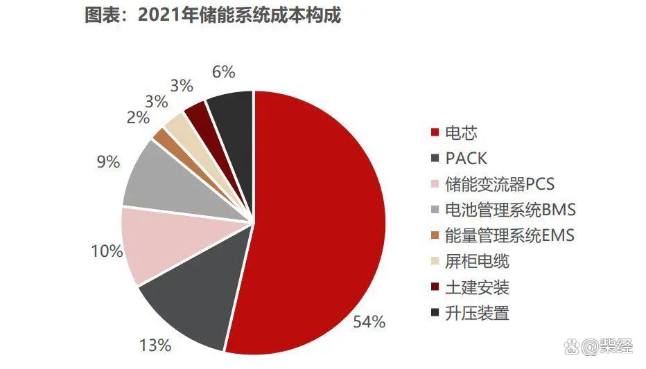 從儲(chǔ)能系統(tǒng)的構(gòu)成來看,儲(chǔ)能電池組最為主要的構(gòu)成部分是——電芯,占據(jù)儲(chǔ)能電池的比例約為80%。那么“電芯”和“PACK”分別占儲(chǔ)能系統(tǒng)的54%、13%。