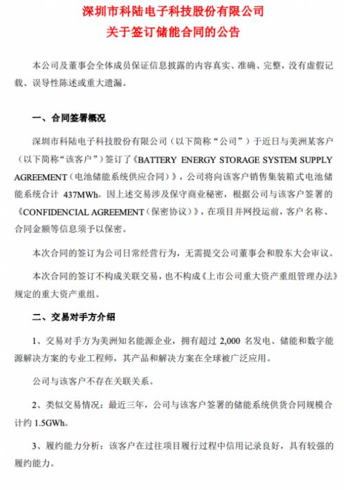 據(jù)悉,交易對(duì)手方為美洲知名能源企業(yè),擁有超過(guò)2,000名發(fā)電、儲(chǔ)能和數(shù)字能源解決方案的專業(yè)工程師,其產(chǎn)品和解決方案在全球被廣泛應(yīng)用。公告顯示,最近三年,科陸電子與該客戶簽署的儲(chǔ)能系統(tǒng)供貨合同規(guī)模合計(jì)約1.5GWh。