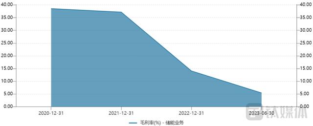 而細看公司儲能業(yè)務的毛利率,可以得知自2020年開始,該業(yè)務毛利率逐年下滑,其中2022年的下降幅度最為明顯。相關數(shù)據(jù)顯示,2020年—2022年及2023年上半年,儲能業(yè)務的毛利率分別為38.53%、37.17%、14.05%及5.41%。