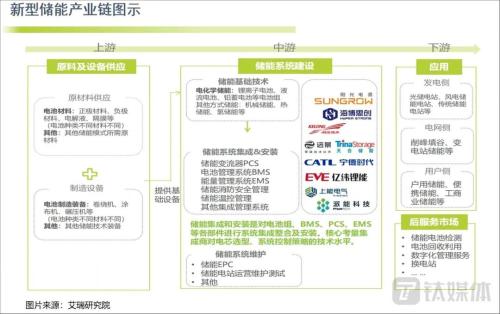 根據(jù)艾瑞研究院的梳理,儲能產(chǎn)業(yè)鏈的上游主要是電池材料的原材料供應(yīng)商和制造商;中游則是系統(tǒng)建設(shè)環(huán)節(jié),包括基礎(chǔ)技術(shù)、系統(tǒng)集成安裝和系統(tǒng)運維三大部分,市場中最知名的寧德時代、億鋰緯能、陽光電源、天合光能等都處于中游;下游則是發(fā)電側(cè)、電網(wǎng)側(cè)、用戶側(cè)的應(yīng)用及服務(wù)。