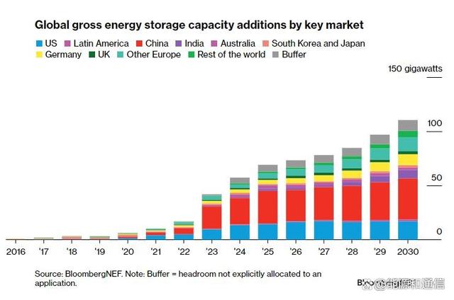 BloombergNEF對(duì)全球主要地區(qū)到2030年底的安裝量預(yù)測(cè)。