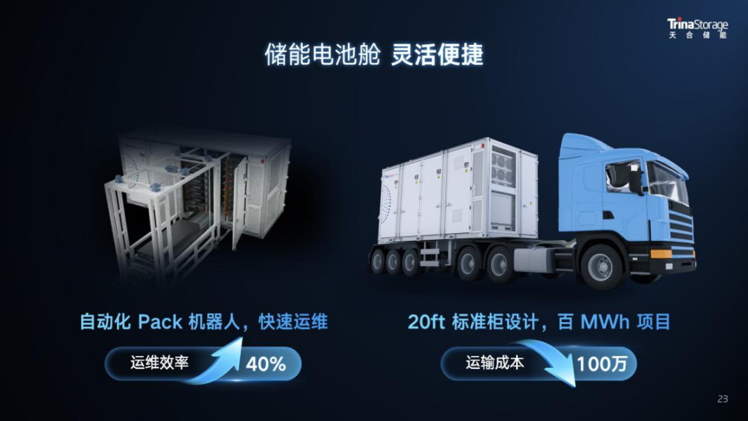 5MWh儲能系統(tǒng)在降本增效上具有突出優(yōu)勢,如更低的度電成本、更優(yōu)的組合方案,標(biāo)準(zhǔn)尺寸下更高的能量密度。同時(shí),也面臨著一些挑戰(zhàn),如電芯一致性與電池簇間能量均衡管理,更大Pack設(shè)計(jì)下對于結(jié)構(gòu)、散熱、安全設(shè)計(jì)的挑戰(zhàn)以及約40噸重量運(yùn)輸?shù)碾y題。天合儲能著眼當(dāng)前市場需求,創(chuàng)新提出天合方案。
