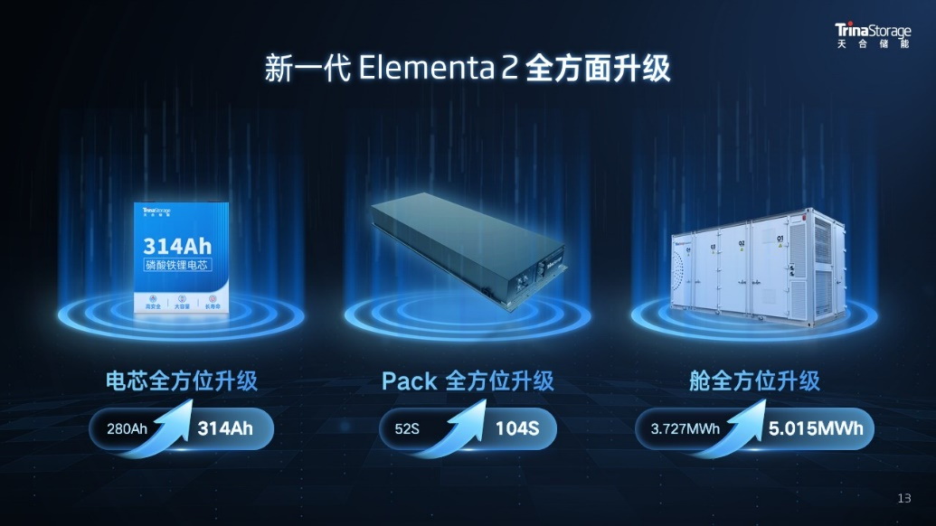 新一代柔性液冷電池艙Elementa 2系統(tǒng)能量由原先一代的3.727MWh提升至5.015MWh,采用的是自研自產(chǎn)的314Ah天合芯。在20尺柜的使用場景下,314Ah可剛好形成5MWh的系統(tǒng)容量,相比于320Ah,電池子陣超配量更少,可以降低客戶的初始投資成本,達(dá)成20尺儲能系統(tǒng)標(biāo)準(zhǔn)空間下容量與成本的最優(yōu)平衡。