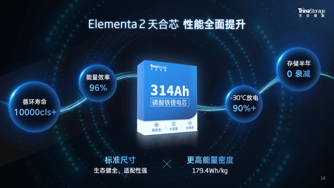 通過優(yōu)化電芯結(jié)構(gòu)和智造工藝,天合自研高安全、高能量密度的314Ah儲能專用電芯,循環(huán)壽命可達(dá)10000cls+,能量密度179.4Wh/kg,能量效率高達(dá)96%,同時(shí)采用主流標(biāo)準(zhǔn)的71173尺寸,完美適配當(dāng)前主流系統(tǒng)集成方案,實(shí)現(xiàn)同尺寸下系統(tǒng)能量的顯著提升。