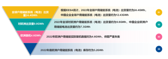 根據(jù)國內(nèi)產(chǎn)業(yè)機(jī)構(gòu)EESA統(tǒng)計(jì),2022年全球戶用儲能系統(tǒng)(電池)出貨量約為24.4GWh,其中對歐洲戶用儲能市場出貨量達(dá)到約9.8GWh;然而,2022年歐洲戶用儲能實(shí)際裝機(jī)4.6GWh,僅2022年底歐洲戶用儲能系統(tǒng)(電池)庫存約為5.2GWh。